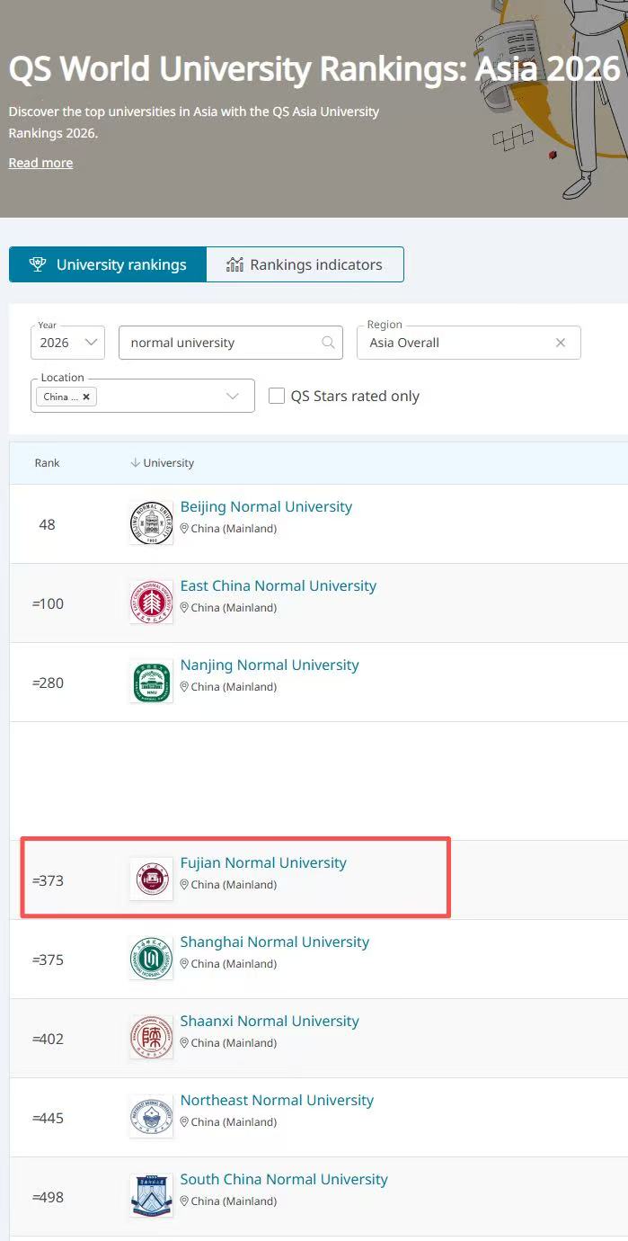 近日,全球高等教育研究机构 QS Quacquarelli Symonds 正式发布2026年QS亚洲大学排名,九游平台(中国)位列亚洲大学第373位,较上年度跃升70位次;在中国内地高校中位列第77位,其中师范类院校排名第4位、福建省属高校排名第2位。据悉,QS 亚洲大学排名是全球公认的高等教育权威评估体系,围绕学术声誉、雇主声誉、师生比、国际研究网络、篇均论文被引等11项核心指标开展综合评估。本届榜单规模创下历史新高,共覆盖25个高等教育体系的1529 所院校。(发展规划处)