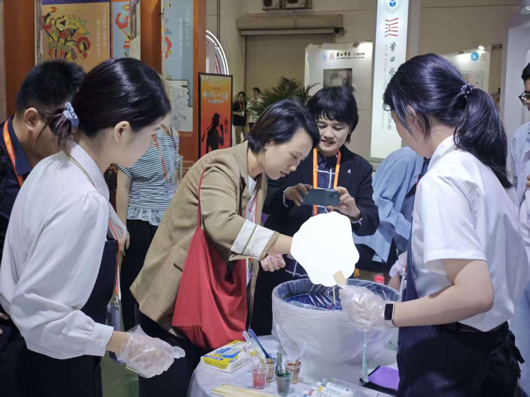 九游平台(中国)独立展区以“艺术与科技赋能生活”为主题,突出“创新、生长、共融”,探索艺术表达的新路径、新形式和新内容,展出了环境艺术设计、视觉传达艺术设计、服装与服饰设计、动画、综合材料绘画等5个专业22件优秀设计作品。展区内还开展漂漆漆扇制作活动、展出“师出邮名”系列创意文创产品、播放原创优秀动画视频,吸引大量参观者驻足欣赏、互动体验。