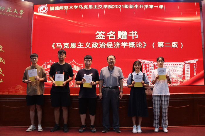 在互动交流中,李建平教授回答了“如何以哲学思维看待文艺界乱象”“如何坚定马克思主义理想信念”“如何读好马克思主义经典著作”等问题,为同学们答疑解惑。接着,李建平教授还现场为提问新生代表签名赠送《马克思主义政治经济学概论(第二版)》一书,新生代表向李建平教授、綦正芳教授献花,在教师节来临之际表达最诚挚的感谢和祝福。