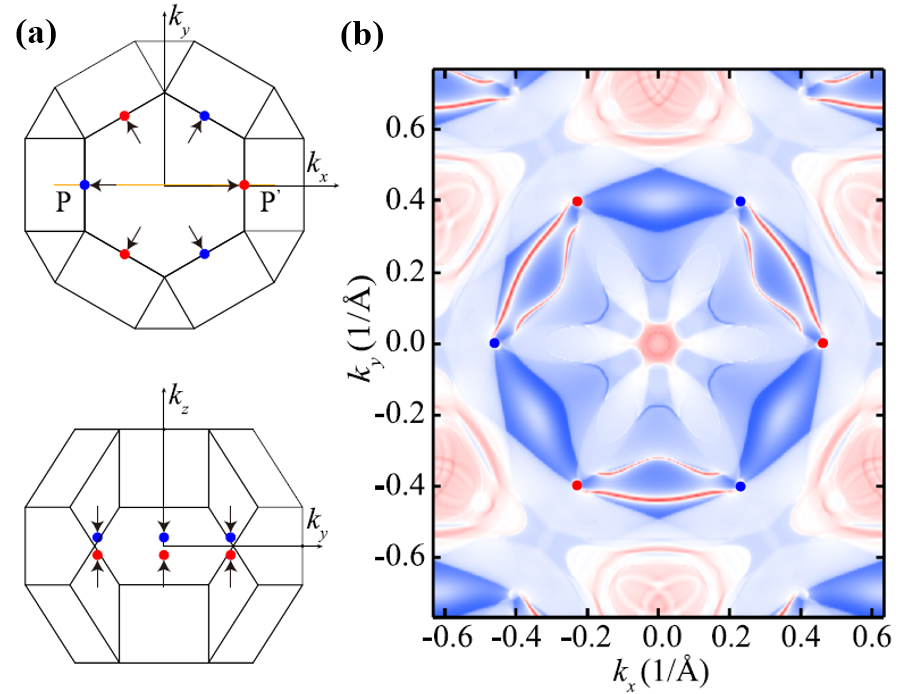 Rh3Sn2S2中外尔点的分布和费米弧。