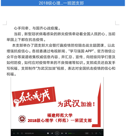 各团支部围绕着团聚青年同战共克时艰作贡献”,开展了各具特色的团支部活动。2019级心理学类二班团支部发起写诗传爱武汉活动,通过诗句接龙,表达对武汉同胞的关爱和祝福;2019级心理学类一班团支部发起以心为壤,抗疫花开疫情防控分享会,同学们通过观看疫情防控知识视频,加深对疫情的了解;2017级心理学(师范)班团支部拍摄视频《我把家乡话说给你听——武汉加油!中国加油!》,声援武汉,共克疫情。