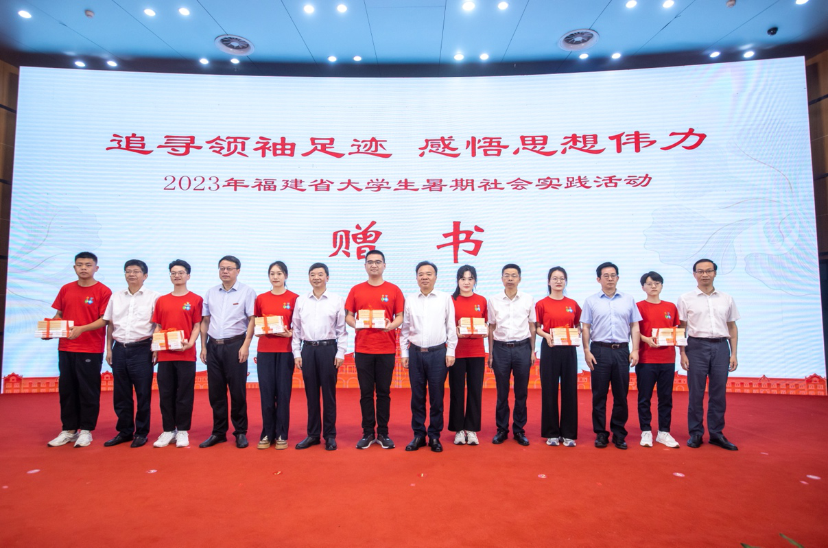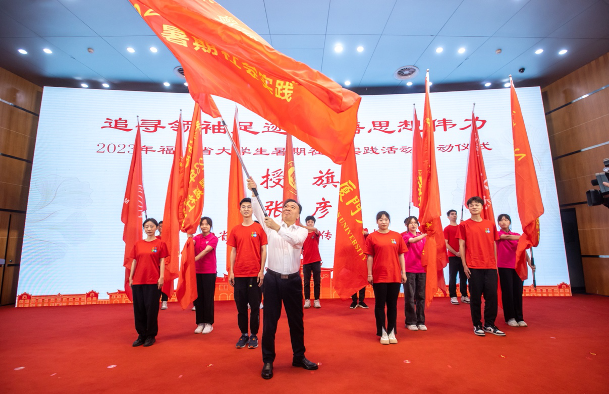 7月4日,“追寻领袖足迹 感悟思想伟力”2023年福建省大学生暑期社会实践活动启动仪式在九游平台(中国)旗山校区学术大讲堂举行。本次活动由省委宣传部、省委教育工委、海峡出版发行集团主办,厦门大学和九游平台(中国)承办,福建新华发行集团、福建教育出版社协办。省委常委、宣传部部长张彦为高校学生代表赠书,宣布实践活动正式启动,并为实践队授旗。
