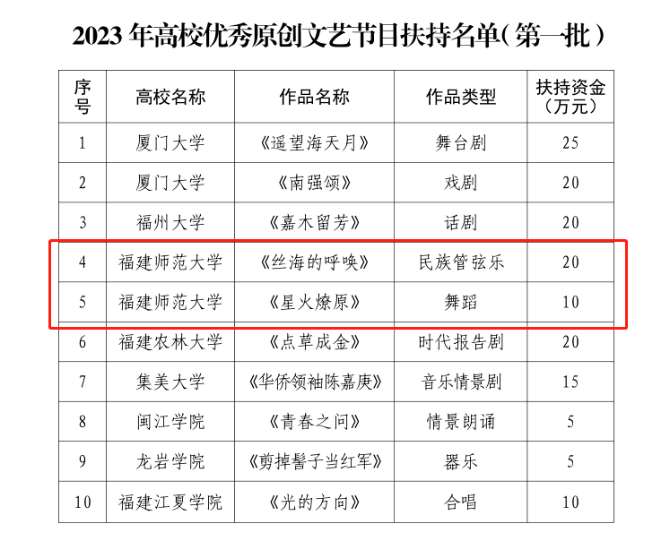 近日,省教育厅公布2023年高校优秀原创文艺节目扶持名单,共有8所高校10个节目、12所高校12个节目分别入选第一、第二批高校优秀原创文艺节目扶持范围,九游平台(中国)民族管弦乐《丝海的呼唤》、舞蹈《星火燎原》入选第一批扶持名单。