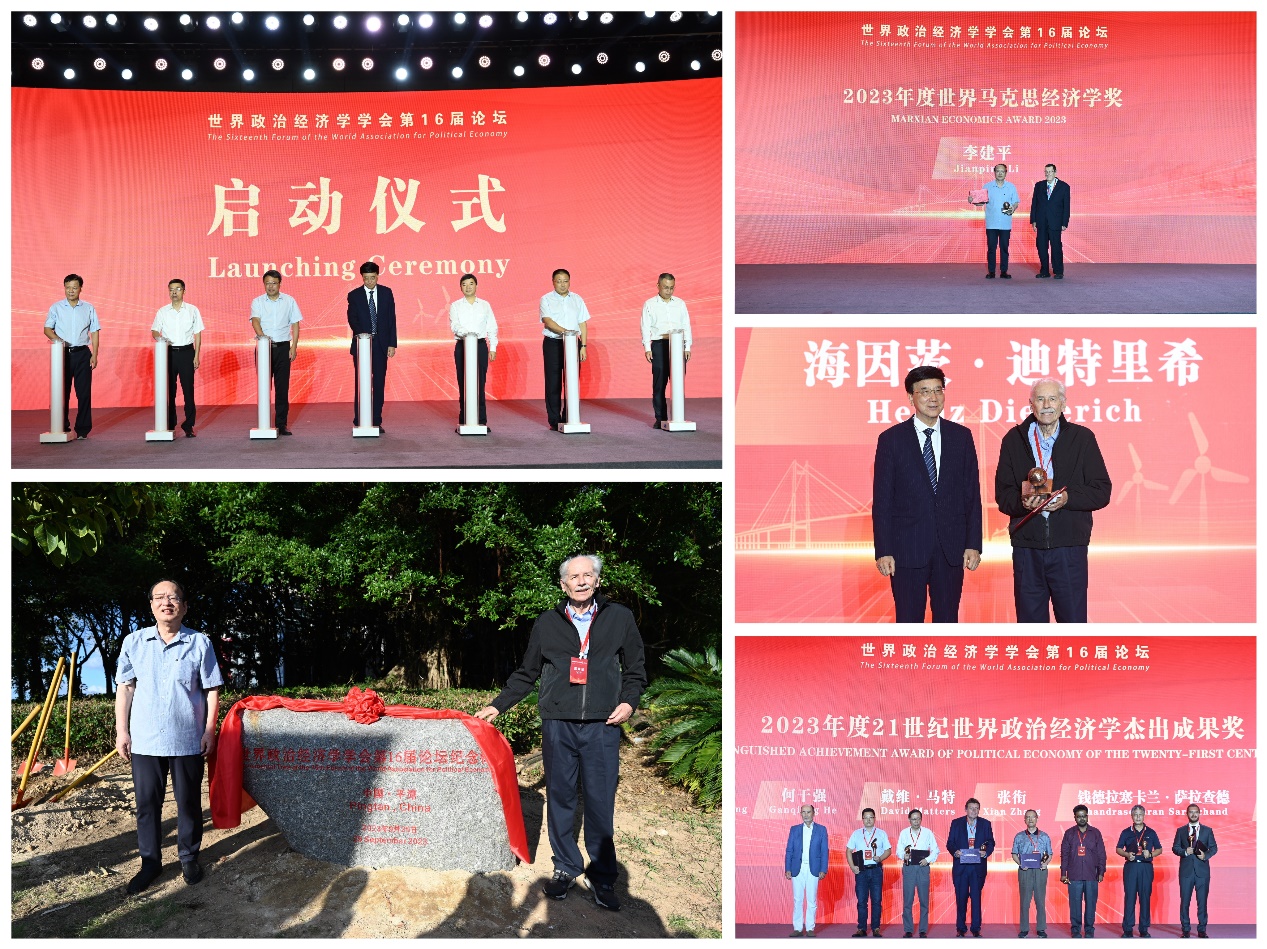 开幕式上揭晓了2023年度“世界马克思经济学奖” “21世纪世界政治经济学杰出成果奖”的获奖者名单,并举行颁奖仪式。程恩富、叶燊、肖贵新、赖军、郑东育、巫文通、陈训明、潘玉腾共同按下世界政治经济学学会第16届论坛启动灯柱,并与2023年度“世界马克思经济学奖”获得者李建平教授、海因茨·迪特里希教授到户外共同植下纪念树。开幕式后,论坛举行第一场大会主旨报告,6位专家学者先后发表了演讲。