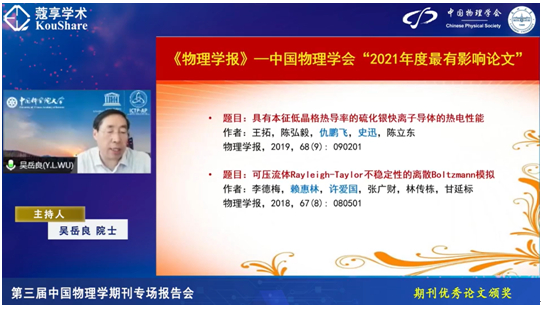 中国物理学会及其主办的期刊自2012年起特设此奖励。该奖项不接受作者申报,综合考虑文章的创新性,以及在Web of Knowledge 数据库的总被引频次、他引频次、施引期刊的影响力和广泛性等。本次从《物理学报》 2017-2019 年发表的2463文章中筛选出10篇文章(其中综述3篇,研究论文7篇),授予“中国物理学会2021年度最有影响论文”奖。