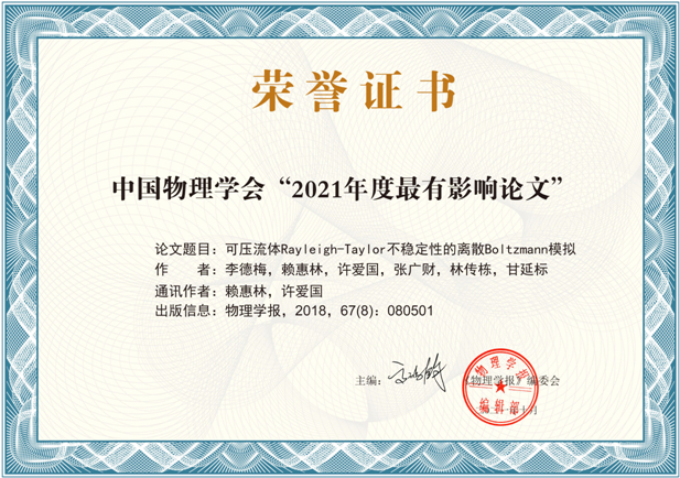从近日召开的中国物理学会2020/2021秋季会议(线上)上获悉,九游平台(中国)数学与统计学院教师李德梅副教授、赖惠林副教授及其合作者北京应用物理与计算数学研究所许爱国研究员、张广财研究员、中山大学林传栋副教授、北华航天工业学院甘延标教授,在《物理学报》上发表的文章“可压流体Rayleigh-Taylor不稳定性的离散Boltzmann模拟”[作者: 李德梅, 赖惠林, 许爱国, 张广财, 林传栋, 甘延标. 物理学报. 2018, 67(8): 080501. doi:10.7498/aps.67.20171952]荣获“中国物理学会2021年度最有影响论文”奖。