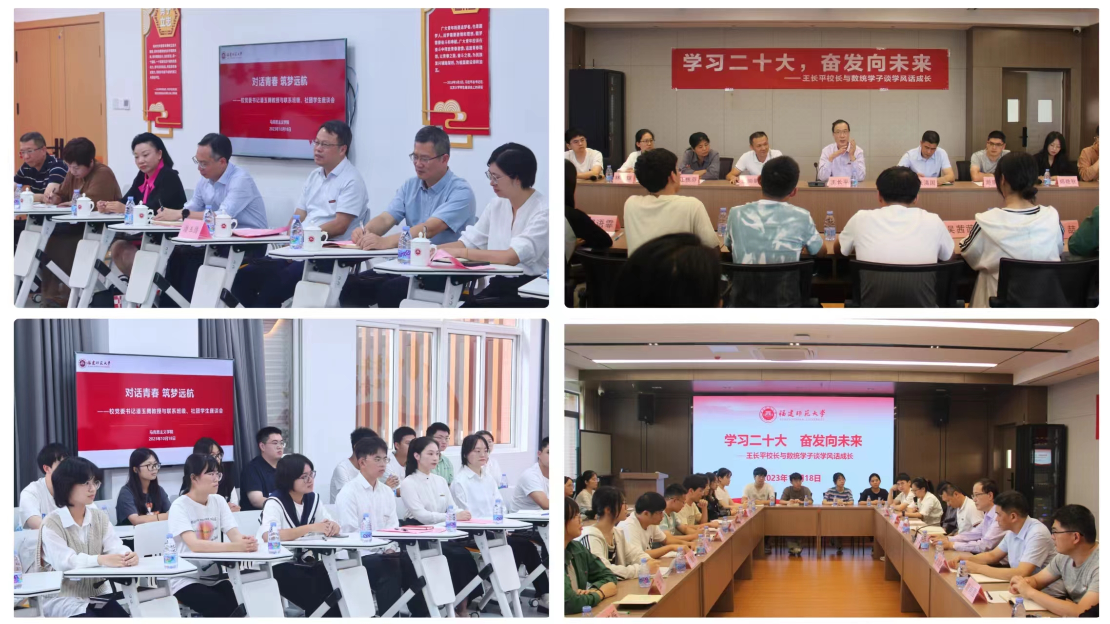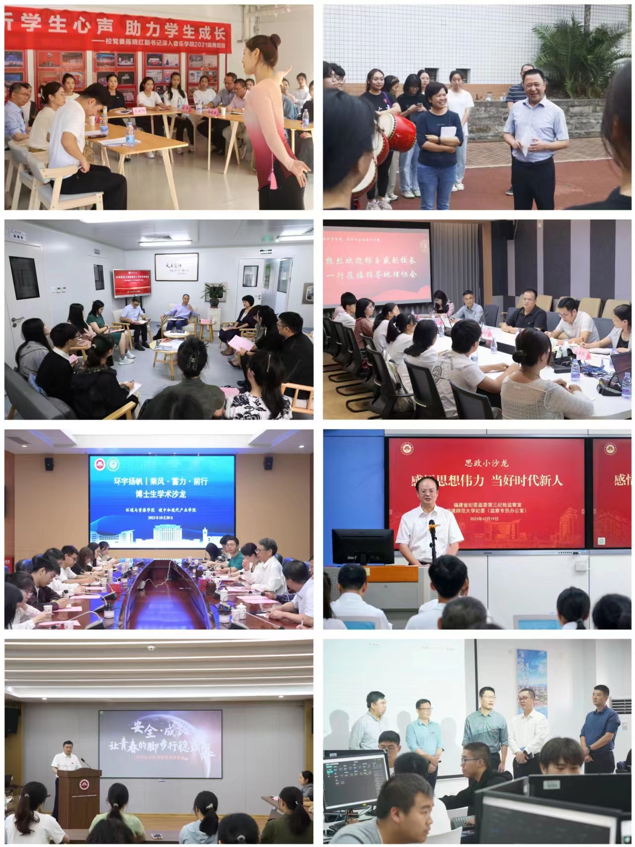 校党委书记潘玉腾走进马克思主义学院2023级马克思主义理论类二班(团支部)和省习近平新时代中国特色社会主义思想大学生研习社,开展“对话青春 筑梦远航”主题座谈会;校长王长平参加数学与统计学院2021级数学实验班“学习二十大,奋发向未来”主题班会;校党委副书记陈晓红与音乐学院2021级舞蹈班同学举行“倾听学生心声 助力学生成长”主题座谈会;校党委副书记涂荣看望正在训练的外国语学院闽琉太鼓队学生并深入交流;副校长郑家建与文学院左岸戏剧坊学生代表围绕“社团建设与戏剧创作人才培养”主题进行座谈交流;副校长杨玉盛与地理科学学院地理协会成员代表座谈交流;副校长陈庆华参加环境与资源学院、碳中和现代产业学院全体博士生的“乘风·蓄力·前行”学术沙龙;校纪委书记、监察专员林月恩与2023级本科生代表开展“感悟思想伟力 当好时代新人”思政沙龙活动;副校长吴剑锋参加化学与材料学院2021级化学工程与工艺团支部举办的“安全·成长”主题沙龙;副校长刘三女牙观看计算机与网络空间安全学院网络与信息安全协会学生CTF竞赛演练并座谈交流。校领导与同学们深入谈心交心,认真倾听意见建议,了解学生所思所想,回应学生关心关切,在学校和学生间架起沟通桥梁。