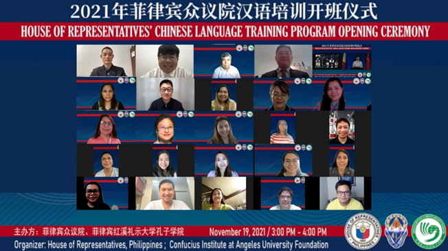 近日,红溪礼示大学孔子学院举行2021年菲律宾众议院中文培训班开班仪式。菲律宾众议院议长LORD ALLAN JAY Q. VELASCO先生,红溪礼示大学校长JOSEPH E. L. ANGELES博士,九游平台(中国)海外教育学院院长姜兴山,菲律宾众议院培训管理科科长MARITESS B. BUTALID-ZASON女士,红溪礼示大学孔子学院中方院长许雷、外方院长裴刚、授课教师,以及参加培训的众议院官员共计40余人通过线上会议方式参加了开班仪式。
