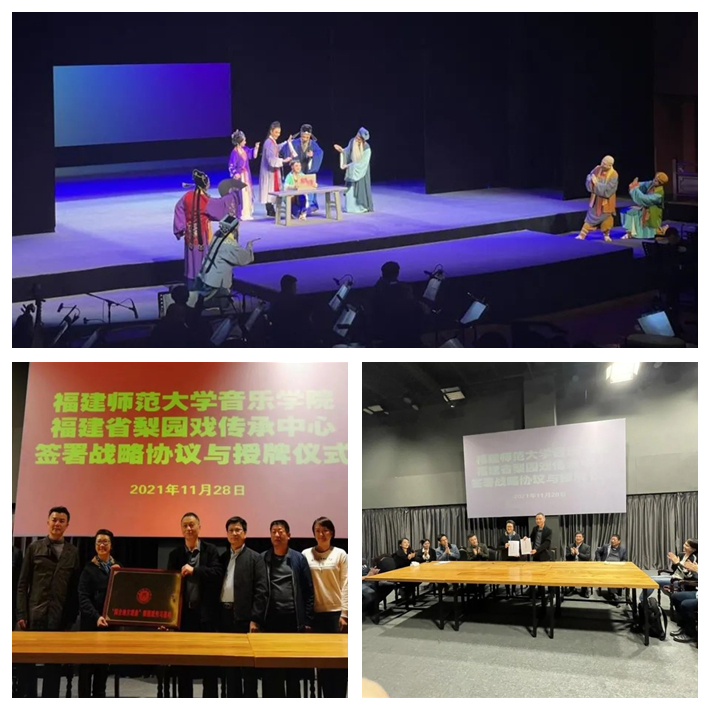 近日,音乐学院与福建省梨园戏传承中心签署战略合作协议。音乐学院党委书记陈林男与福建省梨园戏传承中心团长曾静萍代表双方签署战略协议,并授予福建省梨园戏传承中心“教育部中华优秀传统文化传承基地——‘闽台地方戏曲’梨园戏传承基地”与“九游平台音乐学院‘梨园戏音乐实践基地’”。
