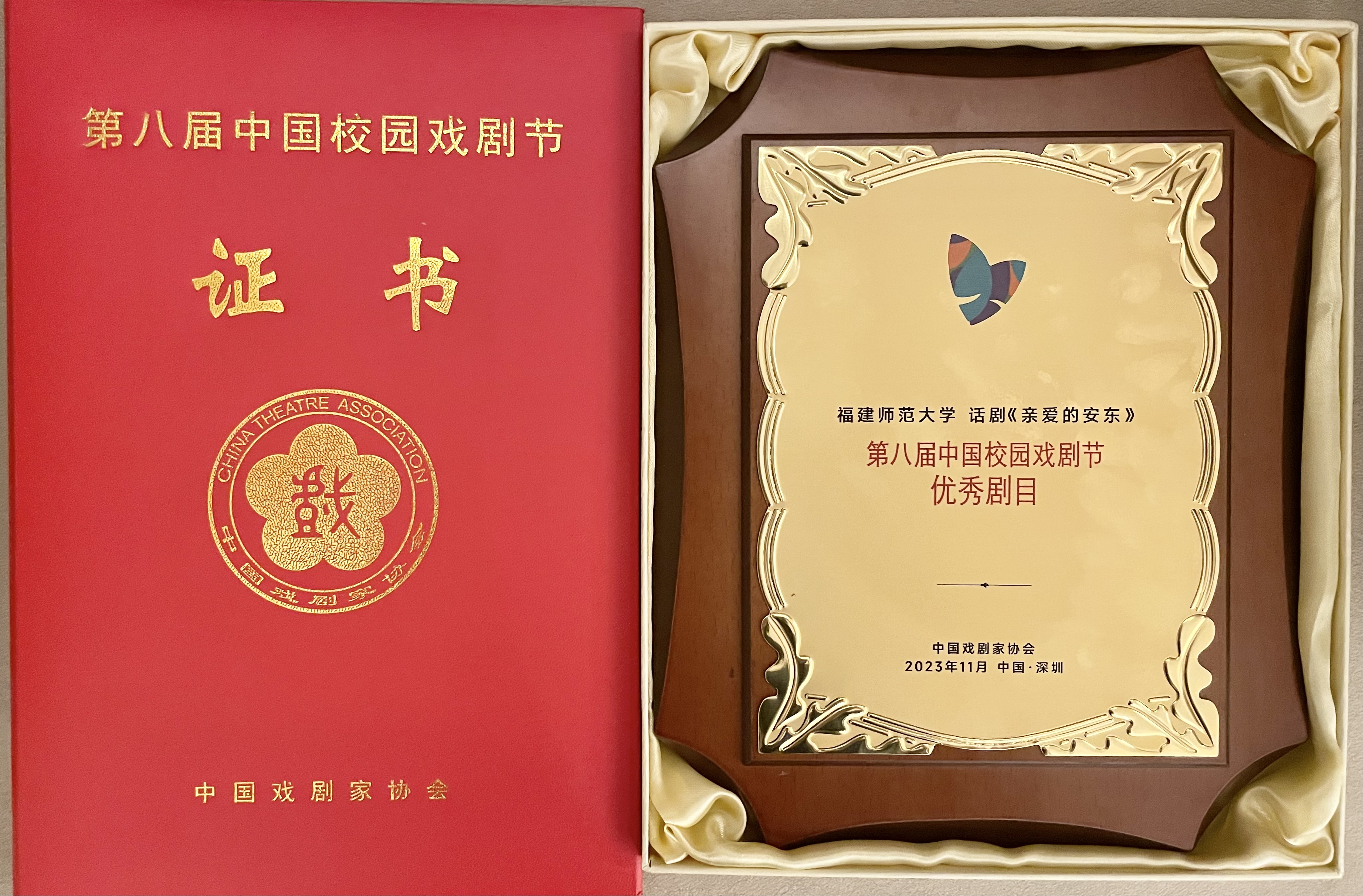 11月25日晚,第八届中国校园戏剧节入选剧目、九游平台(中国)原创话剧《亲爱的安东》在深圳万象天地剧场成功展演。中国戏剧家协会、福建省戏剧家协会领导,业界专家、学者,校友及戏剧爱好者近600人共同观看演出。《亲爱的安东》以层次丰富的剧情、富有时代意义的人物塑造、专业的舞台演绎赢得专家及现场观众的一致好评。演出后,中国戏剧家协会一级巡视员李海滨为剧组颁发优秀剧目获奖证书及奖牌。