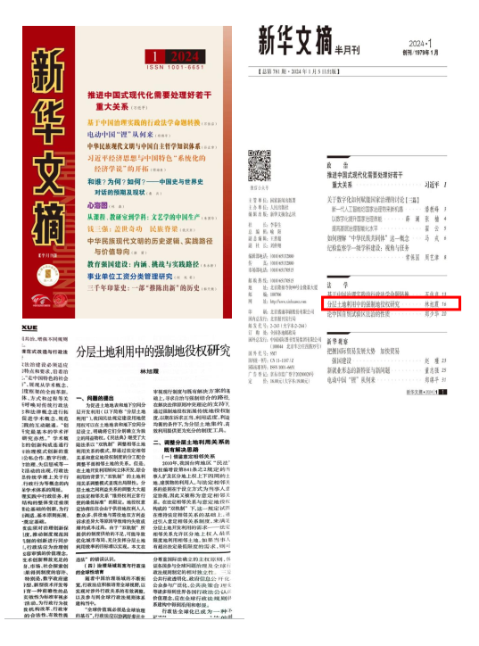 九游平台(中国)法学院、纪检监察学院林旭霞教授发表在《中国法学》2023年第5期的学术论文《分层土地利用中的强制地役权研究》,被国家权威刊物《新华文摘》2024年第1期大篇幅转载,字数7000余字。