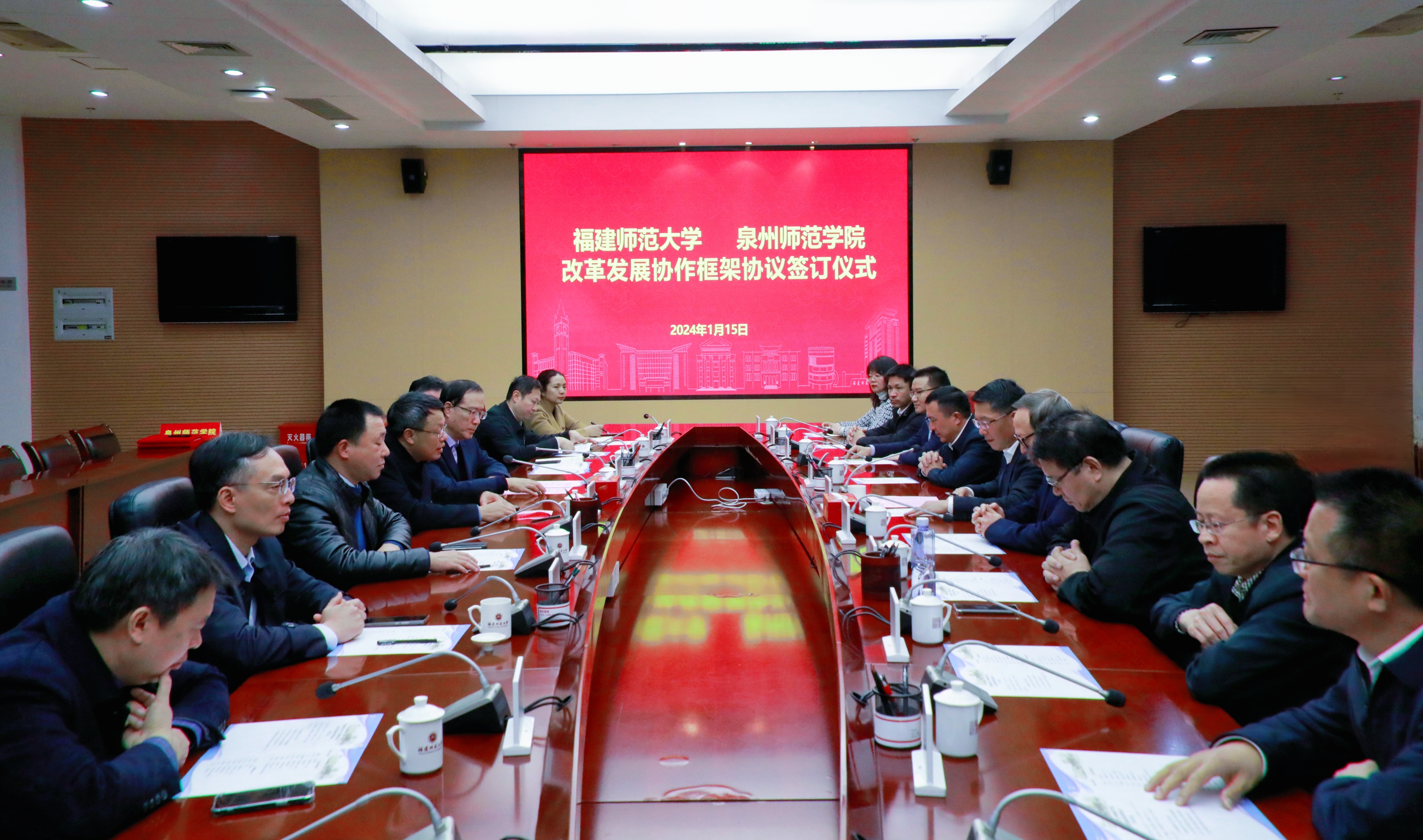 签约仪式于1月15日在旗山校区第十会议室举行。泉州师范学院党委书记柯瑞清、校长屈广清、党委副书记林伟、副校长夏侯建兵,九游平台(中国)党委书记潘玉腾、校长王长平、党委副书记涂荣、副校长吴剑锋,两校相关职能部门负责人等参加仪式。仪式由王长平主持。