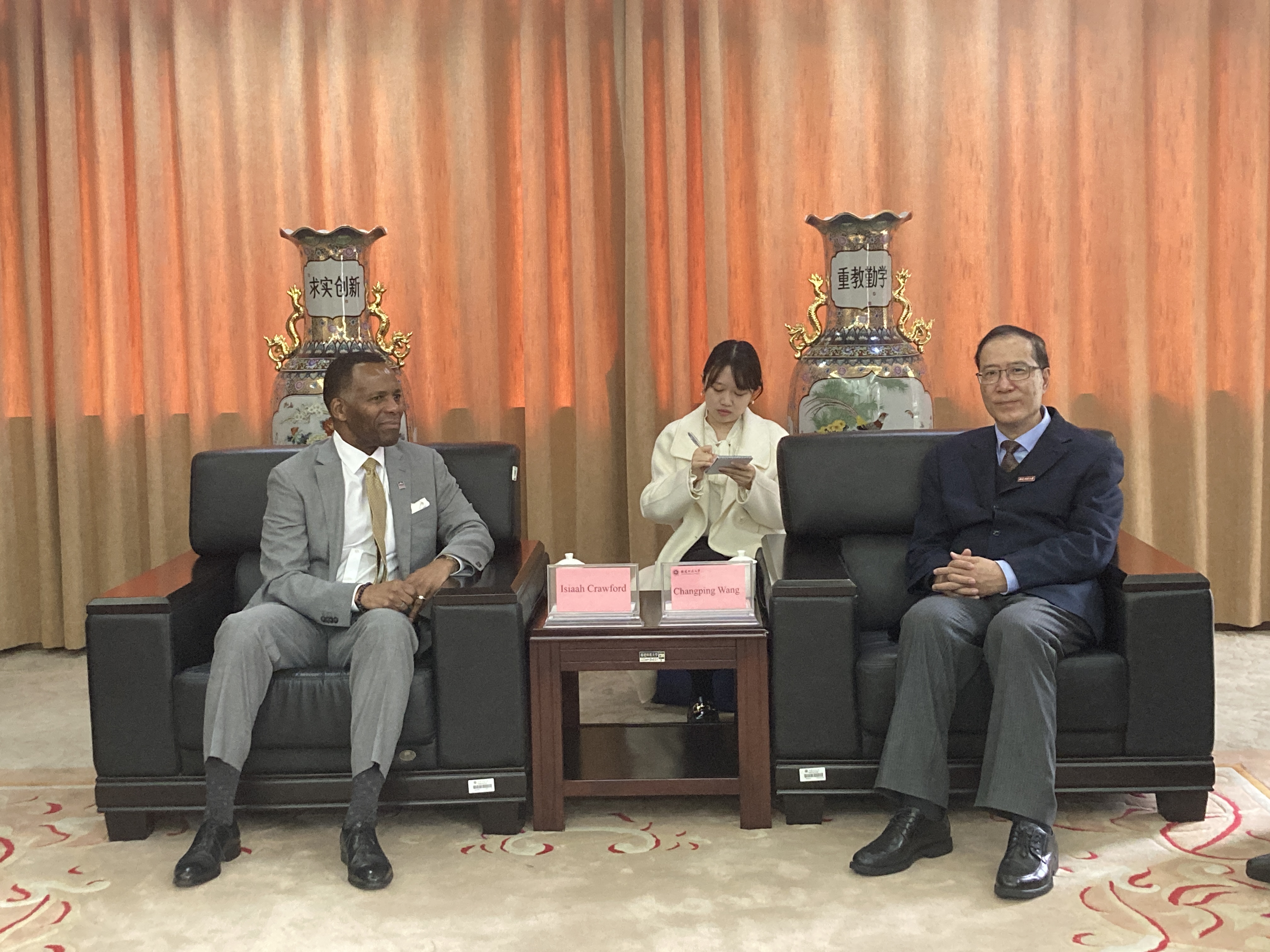 1月20日,美国普及湾大学伊赛亚·克劳福德校长一行来校访问。校长王长平会见来宾一行,国际合作与交流处、社会历史学院、心理学院负责人及外国语学院教师代表参会。