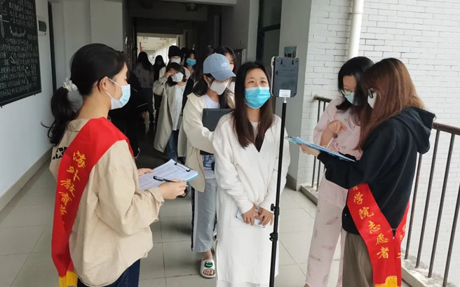 此外,同学们还开展午间自测、晚查寝体温检测,切实落实“早午晚”体温三检,织密“防控网”、筑牢“防疫墙”。