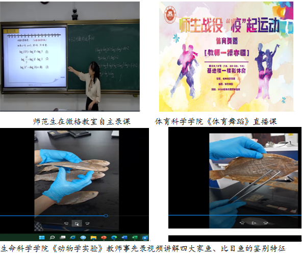 ——实践课程有所创新。各学院结合课程特点积极探索,创新开展了实验教学活动。例如,师范生技能实践课程安排学生课前在微格教室自主录课,课上由任课教师线上点评,顺利实现实践课程的线上线下融合;生命科学学院《动物学实验》由老师对实物标本进行拍照录像并在课堂上进行讲解,有效增强了学生仿真体验;体育科学学院《体育舞蹈》通过在线直播的方式引导师生运动抗疫,当日吸引7893人次观看。