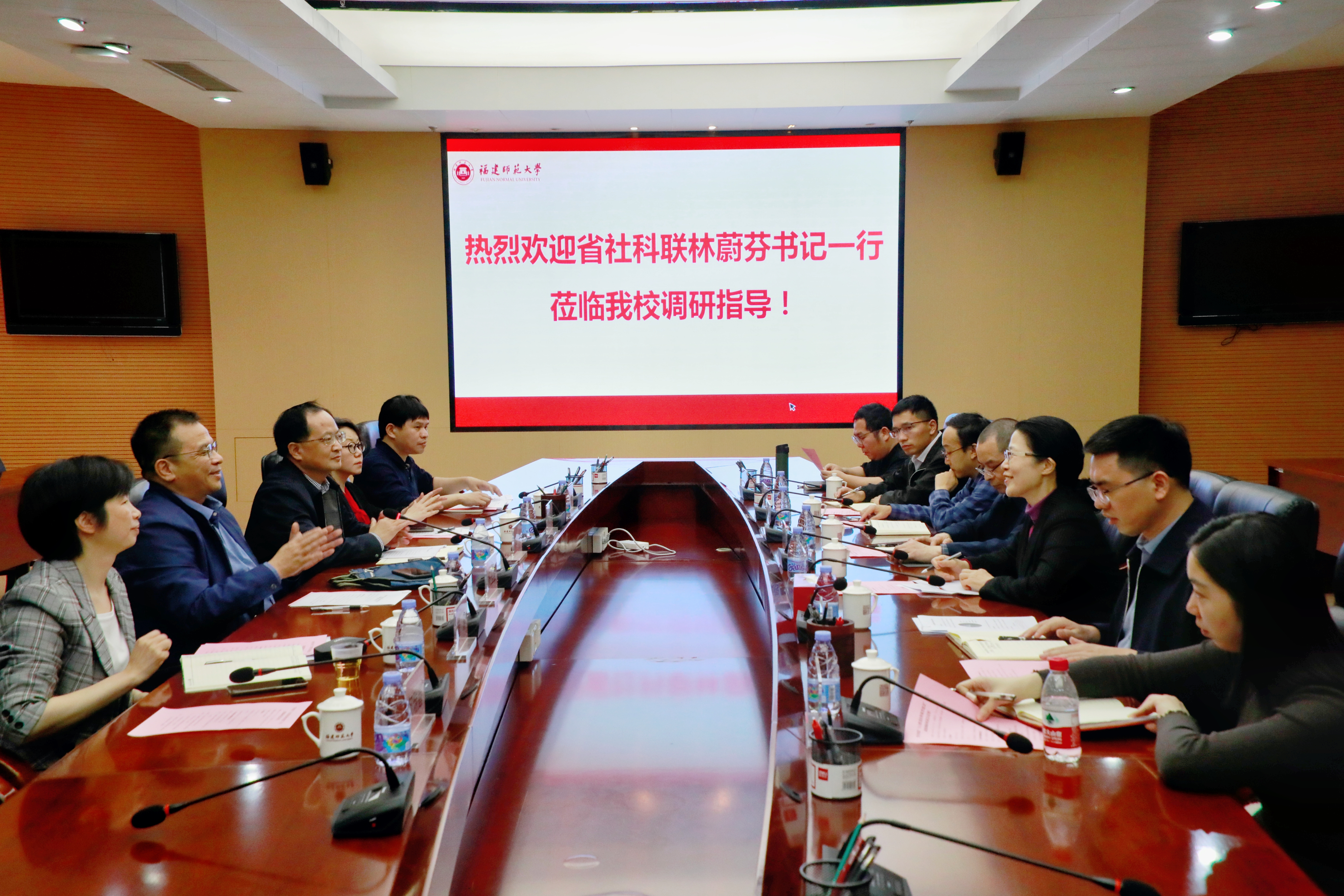 4月11日,省社科联党组书记、副主席林蔚芬一行来校调研“大力推进社科强省建设”情况。校党委书记潘玉腾、副校长杨玉盛陪同调研,宣传部、发展规划处、人事处、社会科学处等单位负责人参加座谈。