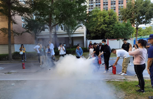 在消防灭火演练环节,救援站的两位同志模拟了火灾现场,并向师生演示了灭火器、灭火毯等消防工具的正确使用方法。现场师生踊跃参与灭火演练。