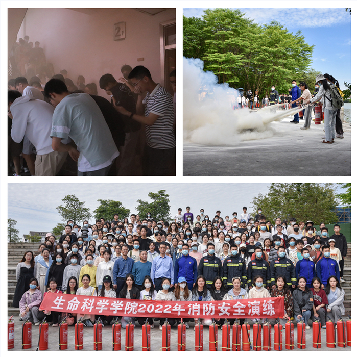 5月18日,生命科学学院在理工楼12号楼及溪源江边开展2022年消防安全演练活动。校保卫处处长张栋、副处长戴文坤,消防科科长曾彦扬,学院党委副书记廖元春、各年级辅导员及学生代表共计250余人参加演练活动。演练活动分为室内火灾紧急疏散和室外灭火器实操演练两个部分。