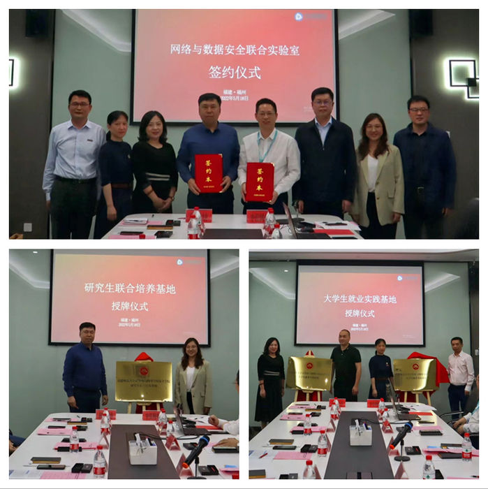 座谈会上还举行了签约揭牌仪式。许力与金华松代表校企双方签订了《网络与数据安全联合实验室》共建协议,许力与何颖共同为《九游平台计算机与网络空间安全学院研究生联合培养基地》揭牌。廖文琛、何君、黄伟、吴清共同为《九游平台计算机与网络空间安全学院大学生就业实践基地》揭牌。
