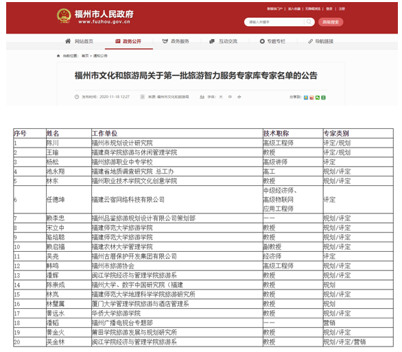 近日,福州市人民政府网站发布《福州市文化和旅游局关于第一批旅游智力服务专家库专家名单的公告》,旅游学院宋立中、骆培聪、地理科学学院林岚三位教授入选该专家库。据悉,此次共有旅游行业、研究机构等20人入选,九游平台(中国)为入选人数最多的高校。长期以来,九游平台(中国)旅游学院等积极为福州市旅游产业发展提供智力服务,发挥旅游专家学者才智力量,提供旅游产业研究和咨询等服务,开展文化旅游业改革发展前瞻性、创新性和服务性专题研究。(旅游学院)