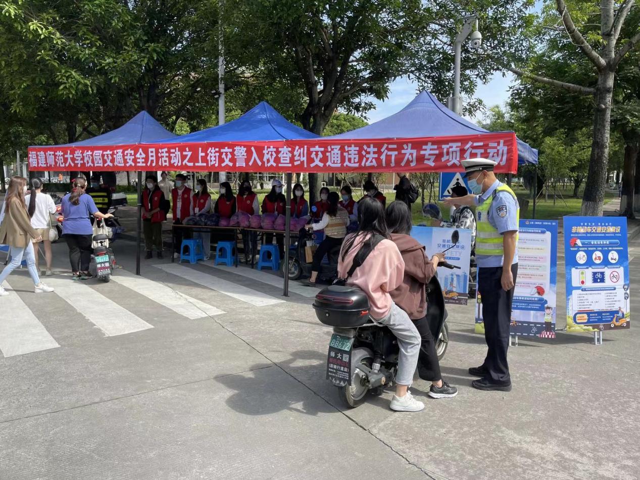 5月18日上午,校保卫处联合上街(高新区)交警大队在旗山校区开展了交通违法违规行为查纠专项行动。活动现场,交警大队民警和学生志愿者通过发放交通安全传单、安全头盔,现场查纠违法违规行为等,教育引导学生自觉遵守交通法律法规和行车规范,养成良好的交通出行习惯。