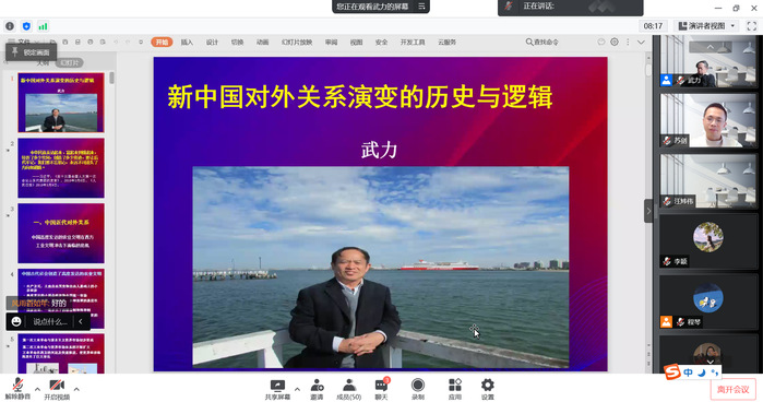 近日,马克思主义学院邀请中国社会科学院当代中国研究所原副所长武力研究员为师生作题为《新中国对外关系演变的历史与逻辑》的线上讲座,学院150余名师生参加了活动。讲座由学院执行院长傅慧芳主持,学院“党史文化与红色精神传承研究”青年教师创新团队承办。