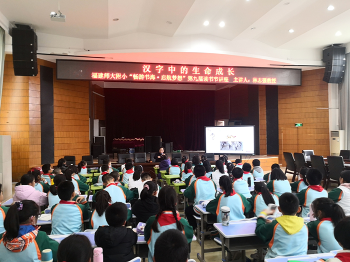 12月28日,附属小学邀请文学院教授林志强开设以《汉字中的生命成长》为主题的读书节名师讲座,100余名学生参加了活动。讲座中,林志强深入浅出地将汉字学知识融合进“孕”“育”“老”等汉字的演变历程与文化内涵,孩子们在聆听知识、互动交流中近距离感受汉字的美丽与文化的力量。现场林教授还设计了趣味竞猜甲骨文环节,学生踊跃参与竞猜,全场氛围热烈。据悉,此次讲座是附属小学“畅游书海,启航梦想”第九届读书节的系列活动之一。除讲座外,系列活动还包含了经典名篇朗诵、好书推荐会、图书漂流等。(附属小学)